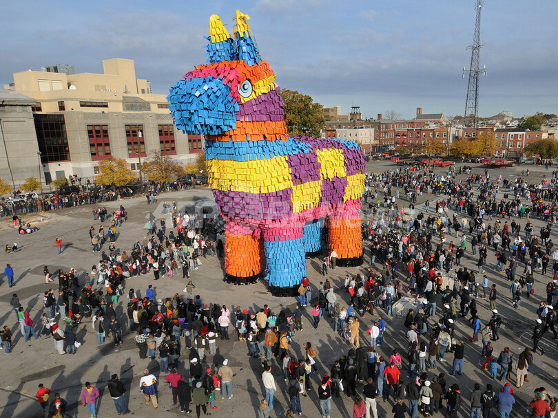 【11月3日 AFP】米ペンシルベニア(Pennsylvania)州フィラデルフィア(Philadelphia)に2日、長さ28.5メートル、高さ18.9メートル、幅7.2メートルの巨大ピニャータ(Pinata、メキシコなどで使われる、中にお菓子やおもちゃなどを詰めた紙製のくす玉人形)が登場した。