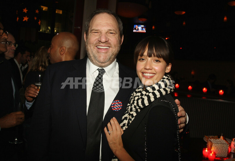 米大統領選挙のパーティー「Bipartisan Election Night Party」に出席する、女優ジェシカ・アルバ(Jessica Alba、右)と映画プロデューサーのハーヴェイ・ワインスタイン(Harvey Weinstein、2008年11月4日撮影)。(c)AFP/Getty Images/Stephen Lovekin