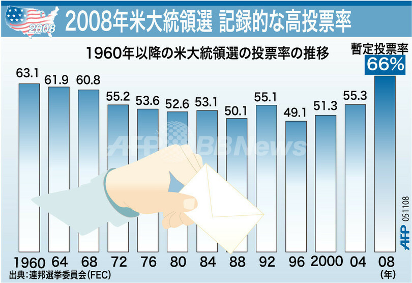 ニュース 政治・経済 図解 【図解】2008年米大統領選 記録的な高投票率 2008年11月5日 20:56 発信地:米国 [ 北米 米国 ] このニュースをシェア (c)AFP 【11月5日 AFP】4日に投開票の行われた米大統領選挙は高投票率を達成した。図は、1960年以降の投票率の推移を示したもの。(c)AFP<ニュース解説画像一覧へ> 政治・経済 一覧へ> メディア・報道関係・法人の方向け 写真・動画 購入のお問合せ>