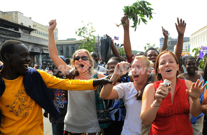 5日夜、首都ナイロビ(Nairobi)やキスム(Kisumu)のナイトスポットには、オバマTシャツを着た人々が集まり、オバマ氏の勝利を祝った。米国大使館の前にも、歓喜する人々が集まった。ナイロビの中心街では花火が打ち上げられた。(c)AFP/Otto Bakano