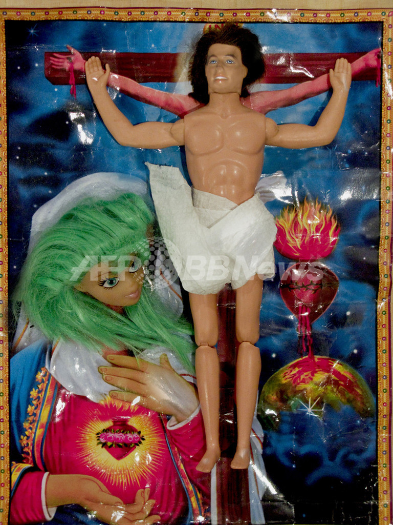 そのほか、バービーのボーイフレンドの人形を十字架に磔(はりつけ)にされたキリスト、緑色の髪の乱れたバービーを聖母マリアとして表現した作品も、撤去の対象となった。(c)AFP