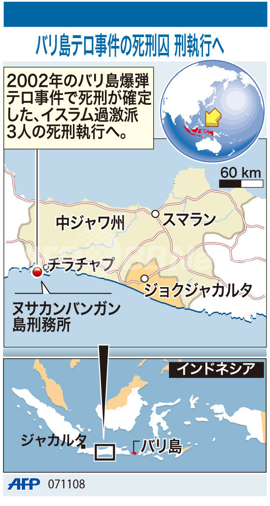 ニュース 戦争・紛争 図解 【図解】バリ島テロ事件の死刑執行場所 2008年11月7日 18:19 発信地:テンガラン/インドネシア [ アジア・オセアニア インドネシア ] このニュースをシェア (c)AFP 【11月7日 AFP】インドネシア・バリ(Bali)島で2002年に発生した爆弾テロ事件で、イスラム過激派の3人の死刑が確定している。図は、刑が執行されるヌサカンバンガン(Nusakambangan)島刑務所の位置を示したもの。(c)AFP<ニュース解説画像一覧へ> 戦争・紛争 一覧へ> メディア・報道関係・法人の方向け 写真・動画 購入のお問合せ>