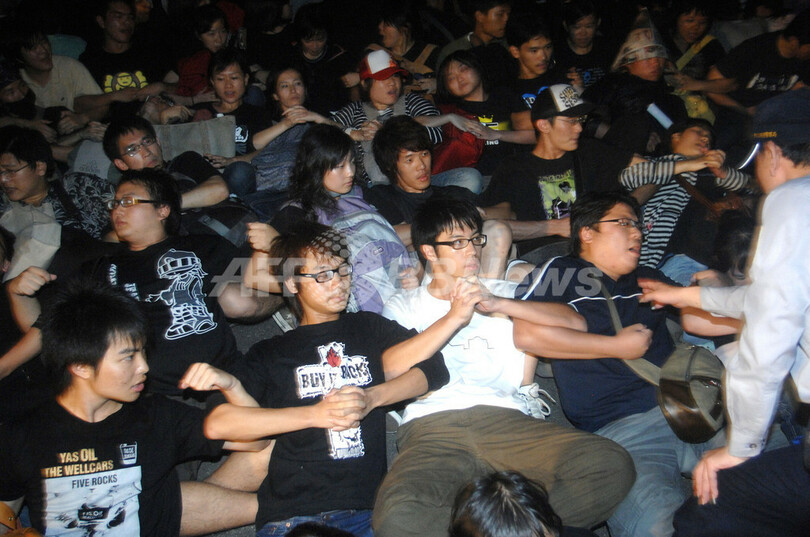 その後、学生ら100人が、政府庁舎前でデモ参加者らの拘束に抗議する座り込みをしたが、警官隊が出動し解散させた。(c)AFP/Amber Wang