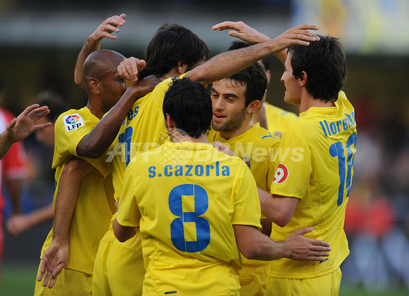 ビジャレアルは、前半1分にジュゼッペ・ロッシ(Giuseppe Rossi)のゴールで先制し、同15分にはホセバ・ジョレンテ(Joseba Llorente)のゴールで追加点を奪った。(c)AFP/Phil Seery