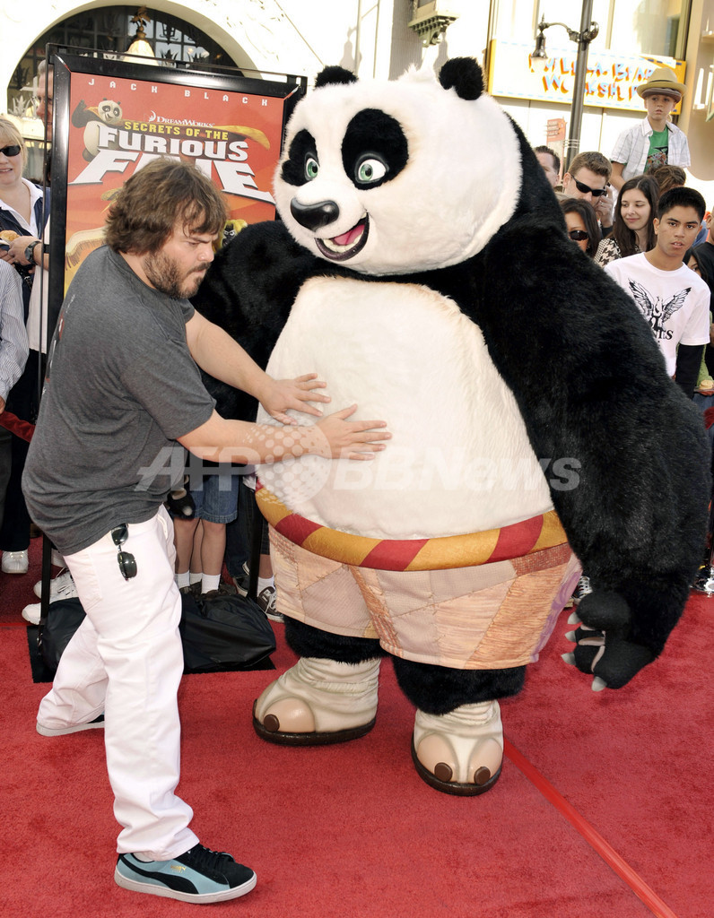 【11月10日 AFP】大ヒットアニメ映画『カンフー・パンダ(Kung Fu Panda)』のDVDリリースを記念したイベントが9日、米カリフォルニア(California)州ロサンゼルス(Los Angeles)で開催された。会場には、主人公のポーとともに、声優として参加した女優アンジェリーナ・ジョリー(Angelina Jolie)、俳優ダスティン・ホフマン(Dustin Hoffman)、ジャック・ブラック(Jack Black)らが登場した。(c)AFP/Getty Images