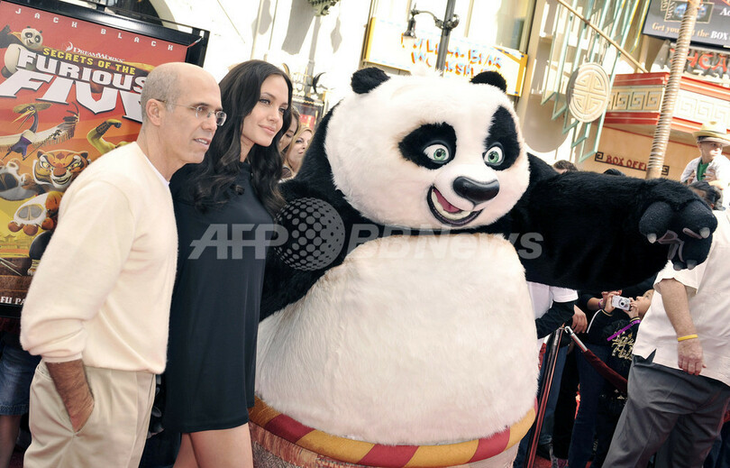 【11月10日 AFP】大ヒットアニメ映画『カンフー・パンダ(Kung Fu Panda)』のDVDリリースを記念したイベントが9日、米カリフォルニア(California)州ロサンゼルス(Los Angeles)で開催された。会場には、主人公のポーとともに、声優として参加した女優アンジェリーナ・ジョリー(Angelina Jolie)、俳優ダスティン・ホフマン(Dustin Hoffman)、ジャック・ブラック(Jack Black)らが登場した。(c)AFP/Getty Images