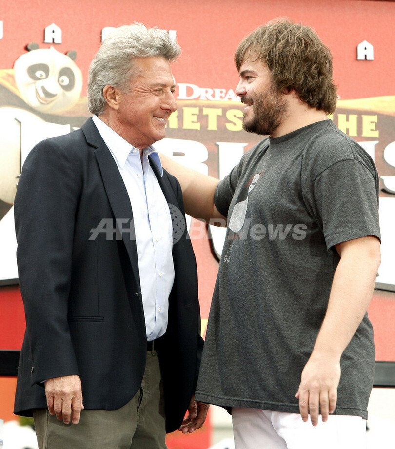 【11月10日 AFP】大ヒットアニメ映画『カンフー・パンダ(Kung Fu Panda)』のDVDリリースを記念したイベントが9日、米カリフォルニア(California)州ロサンゼルス(Los Angeles)で開催された。会場には、主人公のポーとともに、声優として参加した女優アンジェリーナ・ジョリー(Angelina Jolie)、俳優ダスティン・ホフマン(Dustin Hoffman)、ジャック・ブラック(Jack Black)らが登場した。(c)AFP/Getty Images