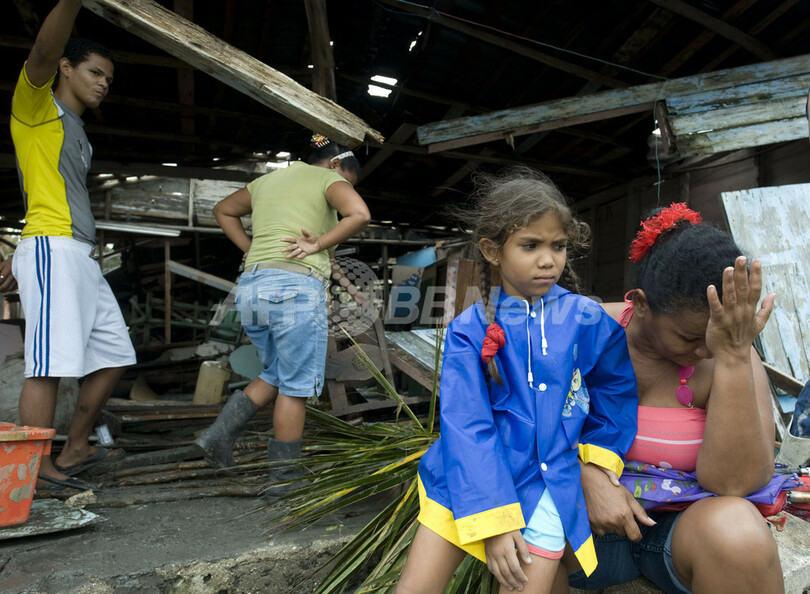 キューバ・サンタクルスデルスール(Santa Cruz del Sur)で、ハリケーン「パロマ(Paloma)」により自宅を破壊され悲嘆にくれる一家。「パロマ(Paloma)」は前週末にかけてキューバ・南東部を通過。その後勢力を弱め、日本時間9日午後9時までに熱帯低気圧となった。(2008年11月9日撮影)。(c)AFP/Adalberto Roque