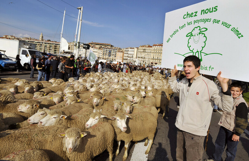 仏マルセイユの街頭に羊が2500頭、畜産家らが抗議デモ