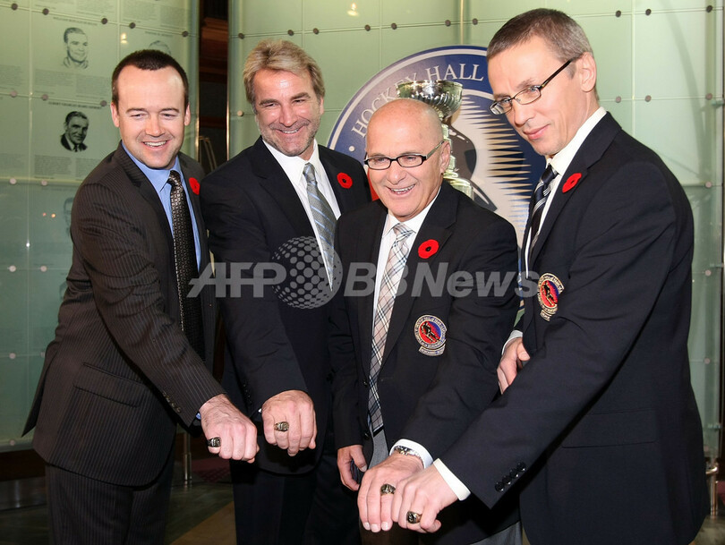 2008年のホッケー殿堂(%%Hockey Hall of Fame%%)入りを果たした(左から)%%Ed Chynoweth%%氏(故人)の息子ジェフ(Jeff)氏、グレン・アンダーソン(%%Glenn Anderson%%)氏、レイ・スカピネロ(%%Ray Scapinello%%)氏、イゴール ・ラリオノフ(%%Igor Larionov%%)氏。(2008年11月10日撮影)(c)AFP/Getty Images/Bruce Bennett