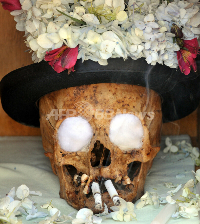 ニュース ライフ 頭蓋骨に供物、ボリビアで先祖の霊を供養 2008年11月14日 15:38 発信地:ラパス/ボリビア [ 中南米 ボリビア ] このニュースをシェア ‹ › ❮ 1/24 ❯ ボリビア・ラパス(La Paz)の共同墓地で、生花や帽子で飾られ、タバコを供えられた頭蓋(ずがい)骨(2008年11月8日撮影)。(c)AFP/AIZAR RALDES 画像作成中 ! 【11月14日 AFP】ボリビアで8日、先祖の霊を供養する催しが行われ、ラパス(La Paz)では大勢の人々が共同墓地を訪れた。この催しは、クリストファー・コロンブス(Christopher Columbus)が米大陸を発見する以前からアンデス地方に伝わる先住民の伝統行事を起源としており、毎年11月8日に定められている。先祖などの頭蓋(ずがい)骨に生花や帽子で飾り付けをしたり、供物をささげる風習がある。(c)AFP ライフ 一覧へ> メディア・報道関係・法人の方向け 写真・動画 購入のお問合せ>