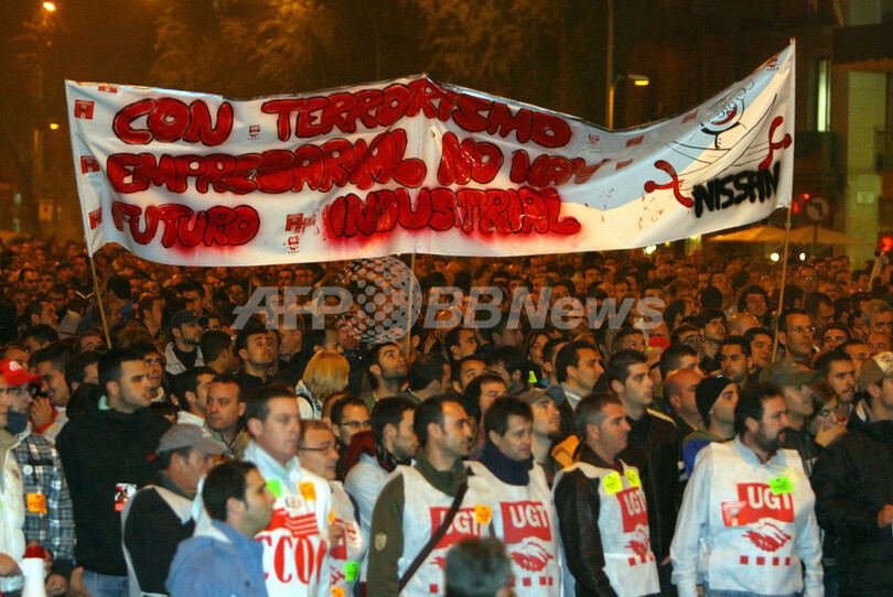 【11月13日 AFP】スペイン・バルセロナ(Barcelona)で11日、日産自動車(Nissan Motor)の現地工場の雇用削減に反対する従業員ら数百人が抗議でデモを行い、一部の参加者が日産オフィスの入っている建物に卵や看板を投げつけるなどして気勢をあげた。市内中心部の大通りも、デモ隊によって交通が遮断される事態となった。