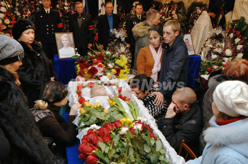 ロシア・コムソモリスクナアムーレ(Komsomolsk on Amur)で行われた、ロシア海軍原子力潜水艦「ネルパ(Nerpa)」での事故で死亡した乗組員らの葬儀(2008年11月12日撮影)。(c)AFP/RIA NOVOSTI/VALERY SPIDLEN