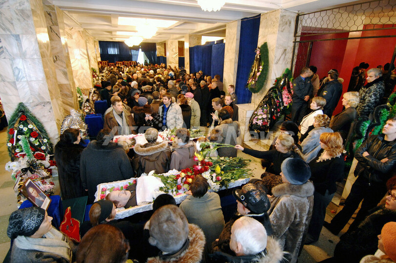 ロシア・コムソモリスクナアムーレ(Komsomolsk on Amur)で行われた、ロシア海軍原子力潜水艦「ネルパ(Nerpa)」での事故で死亡した乗組員らの葬儀(2008年11月12日撮影)。(c)AFP/RIA NOVOSTI/VALERY SPIDLEN