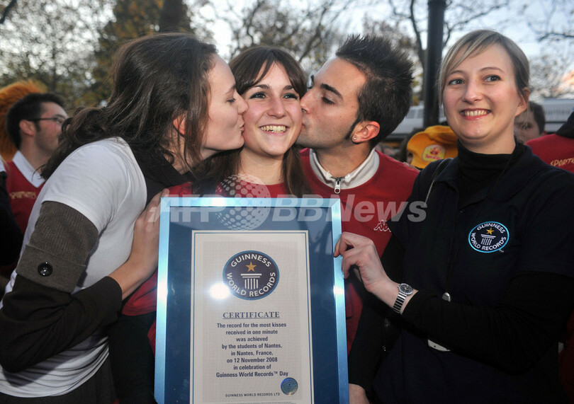 【11月16日 AFP】フランス西部ナント(Nantes)で12日、グランゼコール(高等教育機関)「オデンシア・ナント・マネジメントスクール(Audencia Nantes School of Management)」の学生ソレーヌ・ドゥーセ(Solene Doucet)さんが、1分間に108回ほおにキスをされ「1分間にほおにされたキスの回数」で、ギネス・ワールド・レコーズ(Guiness Worlds Record)社から世界記録に認定された。また、同校の学生バランタン・パスキエ(Valentin Pasquier)さんは、1分間に94回唇にキスをされ、「1分間に唇にされたキスの回数」で、同じく世界記録に認定された。(c)AFP