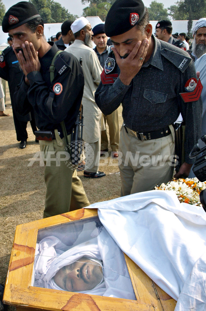 パキスタン・北西辺境(North West Frontier)州で、イラン人外交官の護衛中に武装集団に銃撃され死亡した警察官の遺体と対面した同僚の警察官ら(2008年11月13日撮影)。(c)AFP/Tariq MAHMOOD