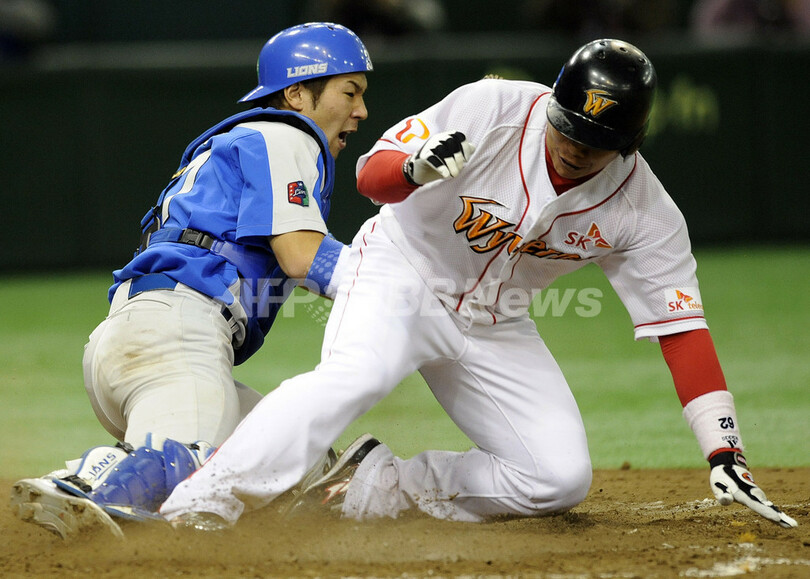 スポーツ 野球 西武ライオンズ SKワイバーンズに敗れ初戦を落とす、アジアシリーズ 2008年11月13日 22:26 発信地:東京 [ アジア・オセアニア 東京 ] このニュースをシェア ‹ › ❮ 7/11 ❯ SKワイバーンズ戦の4回裏、本塁でSKワイバーンズの朴栽弘(%%Park Jae-Hong%%、パク・ジェホン)にタッチする埼玉西武ライオンズの銀仁朗(%%Ginjiro Sumitani%%)。(2008年11月13日撮影)。(c)AFP/TOSHIFUMI KITAMURA 画像作成中 ! 【11月13日 AFP】野球、アジアシリーズ2008(Asia Series 2008)第2試合、埼玉西武ライオンズ(Saitama Seibu Lions)対SKワイバーンズ(Sk Wyverns、韓国)。試合は西武ライオンズが3-4でSKワイバーンズに敗れた。(c)AFP 野球 一覧へ> メディア・報道関係・法人の方向け 写真・動画 購入のお問合せ>