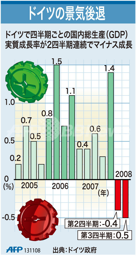 ニュース 政治・経済 図解 【図解】ドイツの景気後退 2008年11月14日 15:42 発信地:ドイツ [ ヨーロッパ ドイツ ] このニュースをシェア (c)AFP 【11月14日 AFP】世界的な金融危機による影響を受け、ドイツが5年ぶりの景気後退に突入した。図は、同国での2005年からのGDP実質成長率の推移を示したもの。(c)AFP<ニュース解説画像一覧へ> 政治・経済 一覧へ> メディア・報道関係・法人の方向け 写真・動画 購入のお問合せ>