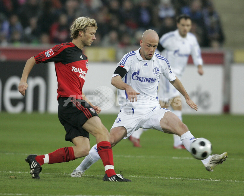 【11月16日 AFP】08-09ドイツ・ブンデスリーガ1部第13節、バイヤー・レバークーゼン(Bayer Leverkusen)対シャルケ04(Schalke04)。前半にパトリック・ヘルメス(Patrick Helmes)とステファン・キースリング(Stefan Kiessling)のゴールでリードを奪ったバイヤー・レバークーゼンは、後半22分にゴンサロ・カストロ(Gonzalo Castro)が2枚目のイエローカードを受け退場処分となり、同40分にはケヴィン・クラニー(Kevin Kuranyi)にゴールを奪われたが、2-1で勝利を収め首位を守った。(c)AFP/Ryland James