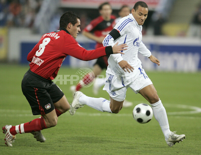 【11月16日 AFP】08-09ドイツ・ブンデスリーガ1部第13節、バイヤー・レバークーゼン(Bayer Leverkusen)対シャルケ04(Schalke04)。前半にパトリック・ヘルメス(Patrick Helmes)とステファン・キースリング(Stefan Kiessling)のゴールでリードを奪ったバイヤー・レバークーゼンは、後半22分にゴンサロ・カストロ(Gonzalo Castro)が2枚目のイエローカードを受け退場処分となり、同40分にはケヴィン・クラニー(Kevin Kuranyi)にゴールを奪われたが、2-1で勝利を収め首位を守った。(c)AFP/Ryland James