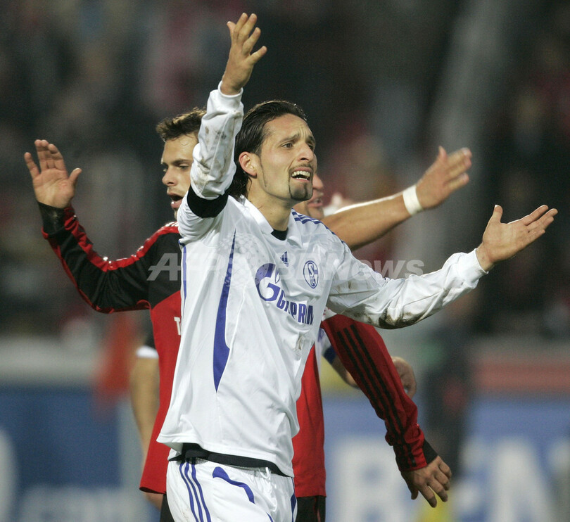 【11月16日 AFP】08-09ドイツ・ブンデスリーガ1部第13節、バイヤー・レバークーゼン(Bayer Leverkusen)対シャルケ04(Schalke04)。前半にパトリック・ヘルメス(Patrick Helmes)とステファン・キースリング(Stefan Kiessling)のゴールでリードを奪ったバイヤー・レバークーゼンは、後半22分にゴンサロ・カストロ(Gonzalo Castro)が2枚目のイエローカードを受け退場処分となり、同40分にはケヴィン・クラニー(Kevin Kuranyi)にゴールを奪われたが、2-1で勝利を収め首位を守った。(c)AFP/Ryland James
