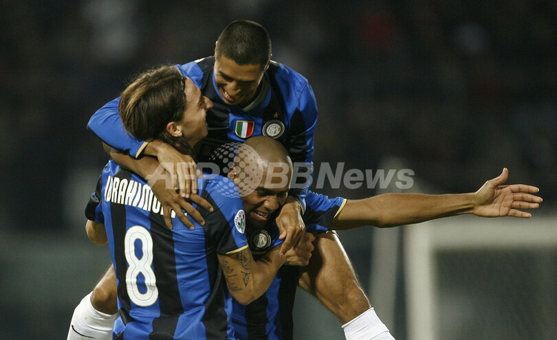 ゴールを決めチームメイトのダグラス・マイコン(%%Douglas Maicon%%)やイバン・コルドバ(%%Ivan Ramiro Cordoba%%、中央)から祝福を受けるインテルのズラタン・イブラヒモビッチ(左)。(2008年11月15日撮影)(c)AFP/MARCELLO PATERNOSTRO