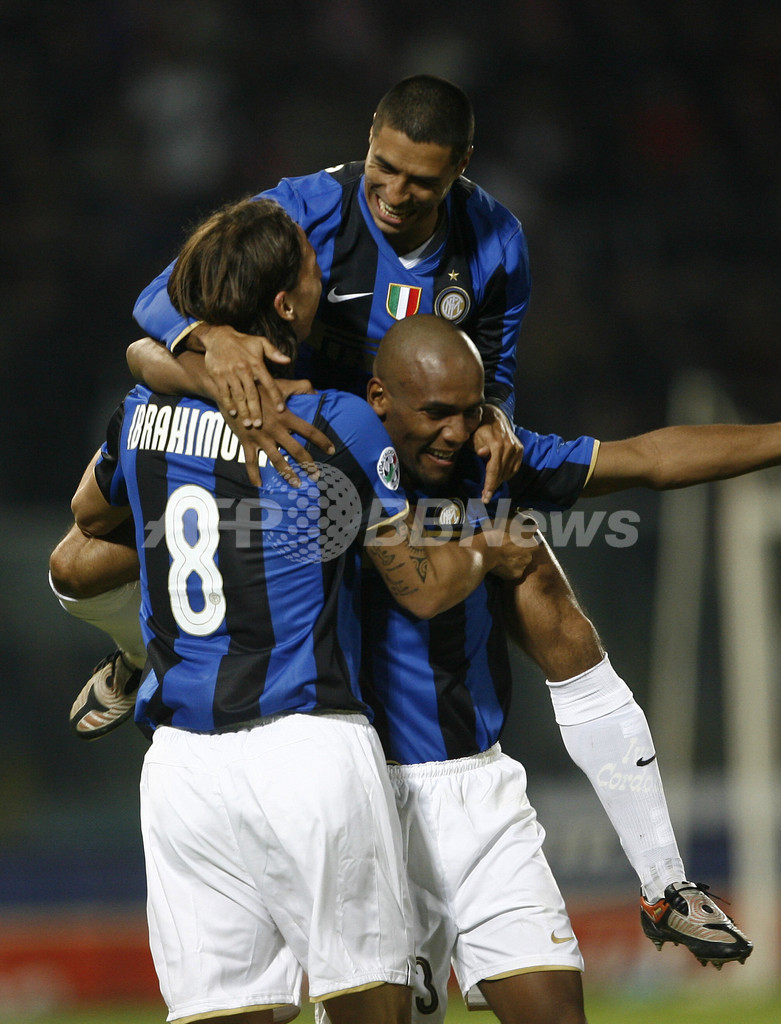ゴールを決めチームメイトのダグラス・マイコン(%%Douglas Maicon%%)とイバン・コルドバ(%%Ivan Ramiro Cordoba%%、中央)から祝福を受けるインテルのズラタン・イブラヒモビッチ(左)。(2008年11月15日撮影)(c)AFP/MARCELLO PATERNOSTRO