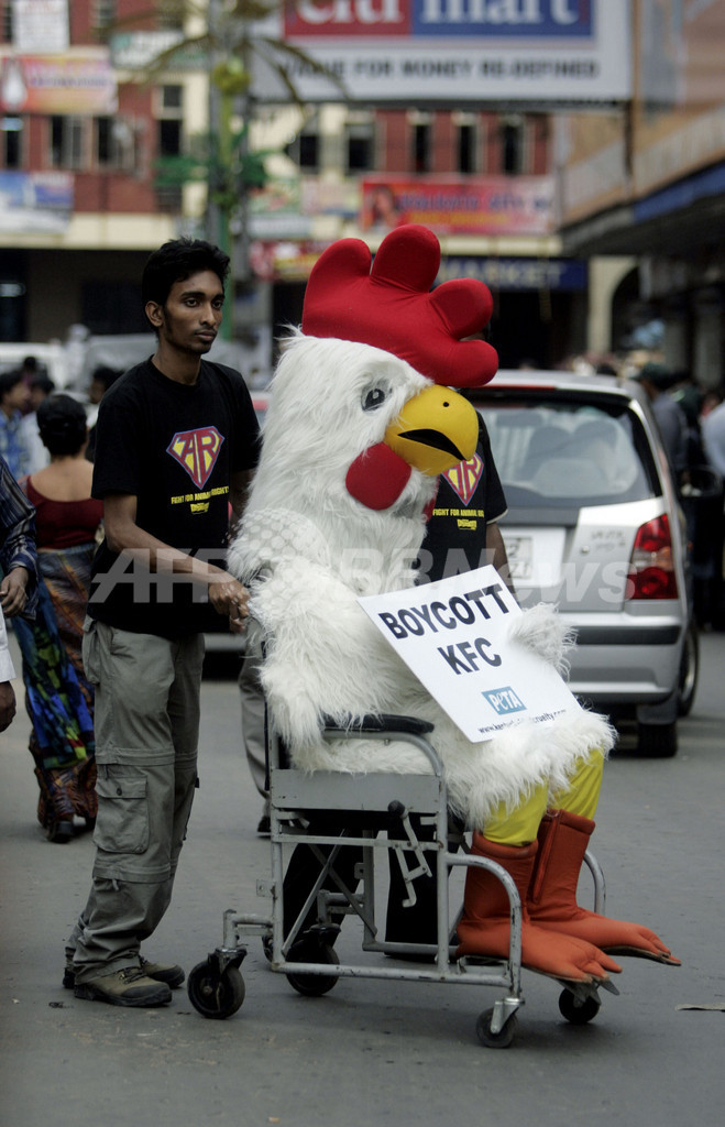 【11月16日 AFP】インドのコルカタ(Kolkata)にある、米ファーストフード大手「ケンタッキーフライドチキン(Kentucky Fried Chicken、KFC) 」の店舗前で13日、国際動物愛護団体「動物の倫理的扱いを求める人々の会(People for the Ethical Treatment of Animals、PETA)」のインド人メンバーが抗議活動を行った。PETAは、KFCが自社の利益のために行っている数百万のニワトリへの非道な虐待を非難し、KFCの食品を食べないよう人々に訴えた。(c)AFP