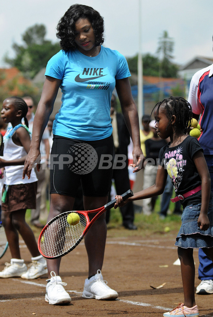 ケニアの首都ナイロビ(Nairobi)にあるSadili Ovalセンターで、子供たちにテニスを教える米テニス選手のセリーナ・ウィリアムズ(Serena Williams)さん。セリーナさんは地元のNGO団体「Build African Schools」と米コンピューター大手ヒューレット・パッカード(Hewlett Packard、HP)と協力して、ケニア東部に「The Serena Williams Secondary School」を開校した。開校の目的は、特にエイズ(HIV/AIDS)や貧困による中退率が高い地域に教育を普及させることだという。(2008年11月15日撮影)。(c)AFP/Tony KARUMBA
