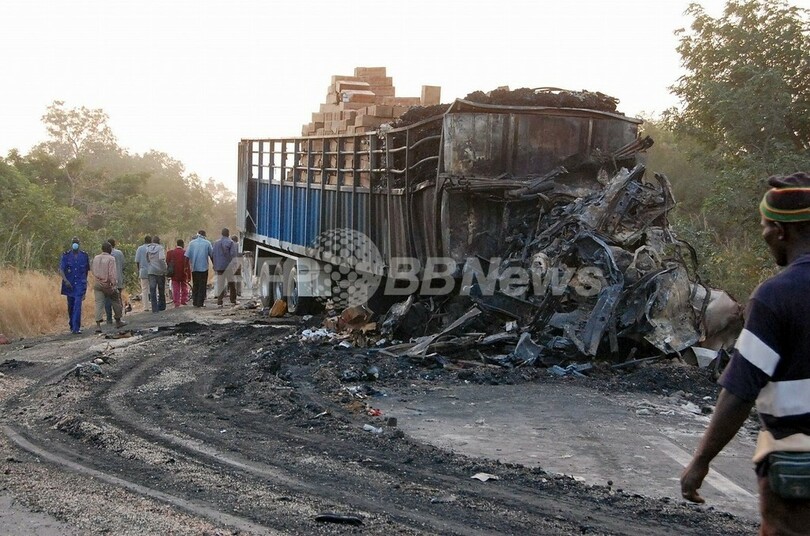西アフリカ各国の道路は、特に夜間の通行が危険なことで知られている。5月にはタンクローリーと軍の車列が衝突し、スーダンのダルフール(Darfur)地方でのアフリカ連合(AU)の平和維持活動から帰還する途中のニジェール兵46人が死亡した。2007年3月には、ギニアで細い木製の橋を渡っていたトラックが横転し、荷台に載っていた70人が死亡する事故が起きている。(c)AFP/Romario Ollo Hien