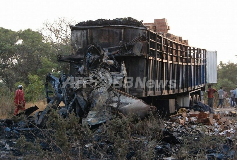 西アフリカ各国の道路は、特に夜間の通行が危険なことで知られている。5月にはタンクローリーと軍の車列が衝突し、スーダンのダルフール(Darfur)地方でのアフリカ連合(AU)の平和維持活動から帰還する途中のニジェール兵46人が死亡した。2007年3月には、ギニアで細い木製の橋を渡っていたトラックが横転し、荷台に載っていた70人が死亡する事故が起きている。(c)AFP/Romario Ollo Hien