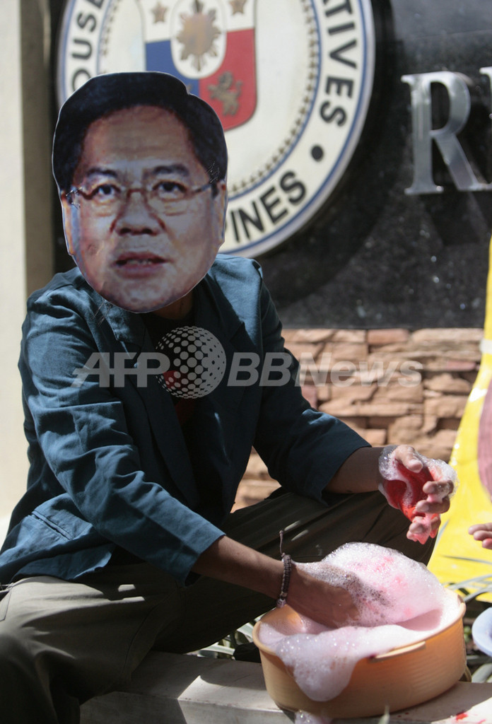 【11月19日 AFP】フィリピンの首都マニラ(Manila)で18日、ジョスリン・ボランテ(Jocelyn Bolante)元農務次官による公金横領疑惑で、グロリア・アロヨ(Gloria Arroyo)大統領の政権に抗議して、下院の建物の前で洗濯をするというデモが行われた。