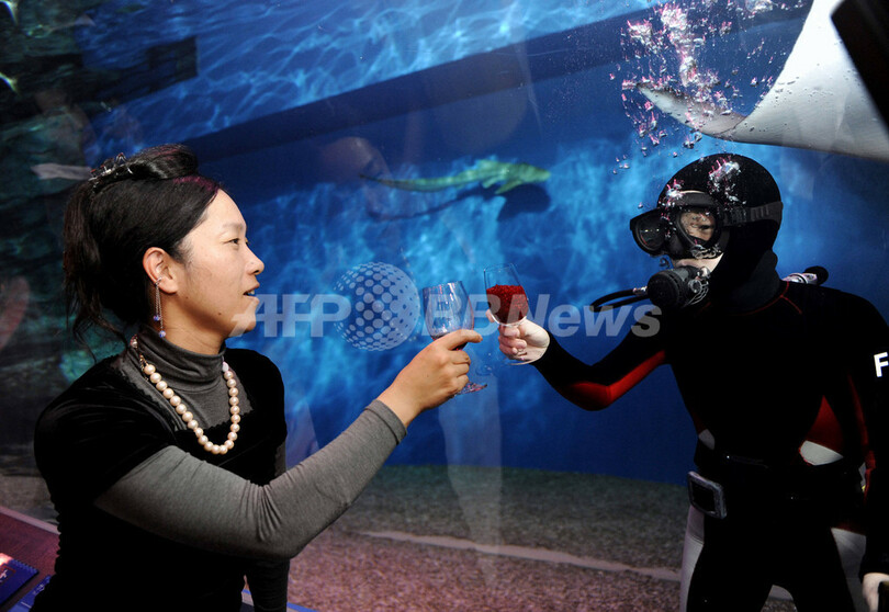 ボジョレー解禁、水槽内で乾杯