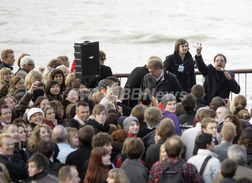 テムズ川(River Thames)河畔にあるロイヤル・フェスティバル・ホール(Royal Festival Hall)前に作られた即席のステージに、伴奏はアコースティクギターの奏者が一人。周囲には携帯電話で写真を取る数百人の群衆が詰めかけた。