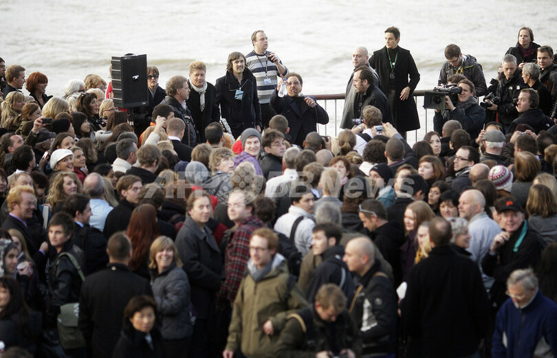 テムズ川(River Thames)河畔にあるロイヤル・フェスティバル・ホール(Royal Festival Hall)前に作られた即席のステージに、伴奏はアコースティクギターの奏者が一人。周囲には携帯電話で写真を取る数百人の群衆が詰めかけた。
