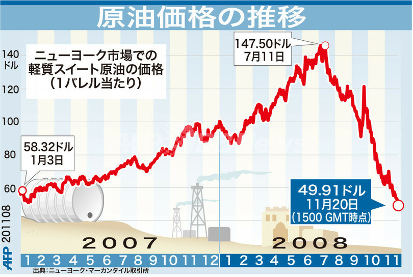 ニュース 政治・経済 図解 【図解】ニューヨーク市場の原油価格推移 2008年11月21日 10:29 発信地:ニューヨーク/米国 [ 北米 米国 ] このニュースをシェア (c)AFP 【11月21日 AFP】図は、2007年1月以来のニューヨーク(New York)市場での軽質スイート原油価格の推移を示したもの。(c)AFP<ニュース解説画像一覧へ> 政治・経済 一覧へ> メディア・報道関係・法人の方向け 写真・動画 購入のお問合せ>