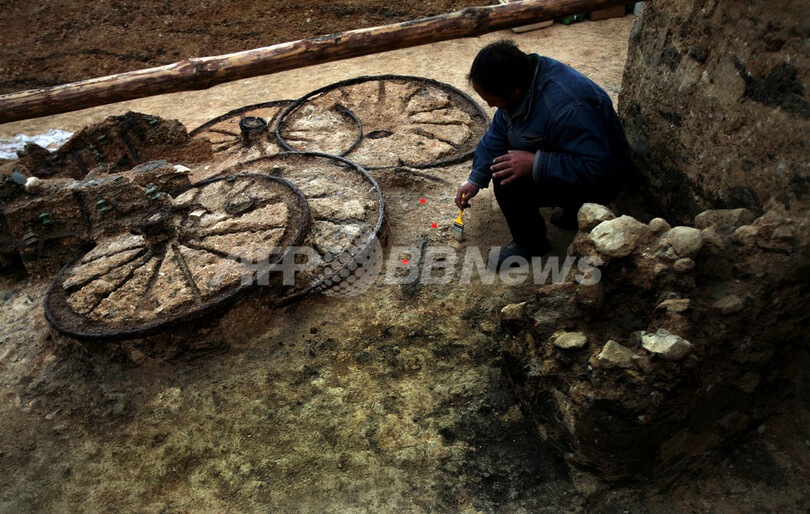 発掘チームのVeselin Ignatov氏は地元ラジオに、出土した馬車の状態が非常に良いと述べ、副葬品を死後の世界に持ち込めるとする古代トラキア人の考えから、裕福な男性の墓に副葬されたものではないかと語った。(c)AFP