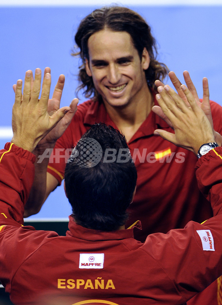 【11月22日 AFP】(訂正)男子テニス・デビスカップ(2008 Davis Cup)・ワールドグループ2008決勝、アルゼンチン対スペイン。スペインのフェリシアーノ・ロペス(Feliciano Lopez)は、第2試合のシングルスでアルゼンチンのファン・マルティン・デルポトロ(Juan Martin Del Potro)と対戦。ベルダスコはセットカウント3-1(4-6、7-6、7-6、6-3)でデルポトロを下し、スペインは対戦成績を1勝1敗のタイに戻した。(c)AFP