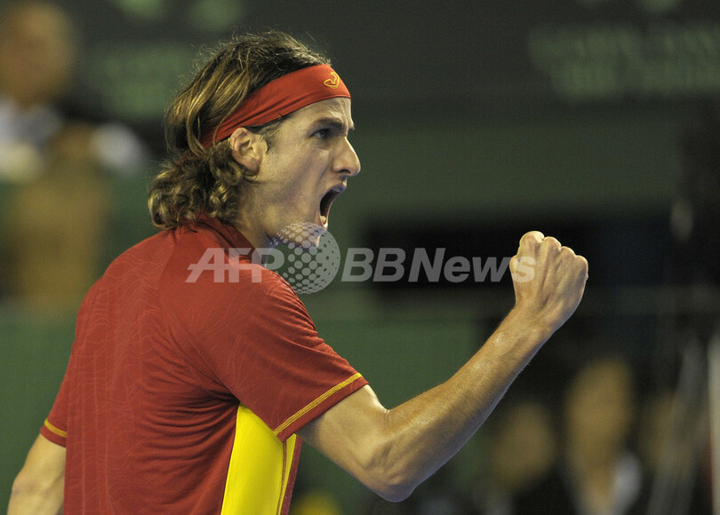 【11月22日 AFP】(訂正)男子テニス・デビスカップ(2008 Davis Cup)・ワールドグループ2008決勝、アルゼンチン対スペイン。スペインのフェリシアーノ・ロペス(Feliciano Lopez)は、第2試合のシングルスでアルゼンチンのファン・マルティン・デルポトロ(Juan Martin Del Potro)と対戦。ベルダスコはセットカウント3-1(4-6、7-6、7-6、6-3)でデルポトロを下し、スペインは対戦成績を1勝1敗のタイに戻した。(c)AFP