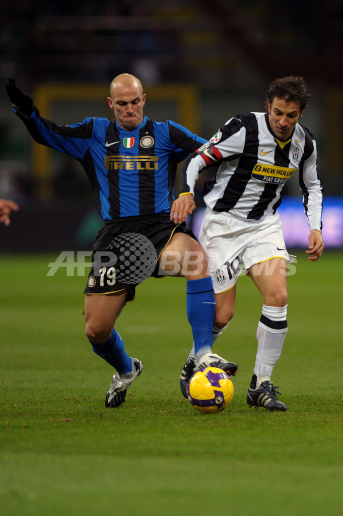 後半17分にサリー・ムンタリ(Sulley Muntari)のゴールで先制したインテルは、その後アレッサンドロ・デル・ピエロ(Alessandro Del Piero)のヘディングシュートをGKジュリオ・セザール(Julio Cesar)がセーブするなどユベントスに得点を許さず、この日試合の無かった2位ACミラン(AC Milan)との勝ち点差を4ポイントまで広げた。(c)AFP/Barnaby Chesterman