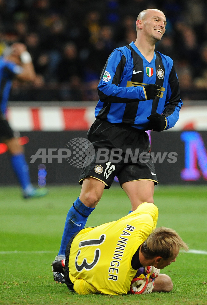 後半17分にサリー・ムンタリ(Sulley Muntari)のゴールで先制したインテルは、その後アレッサンドロ・デル・ピエロ(Alessandro Del Piero)のヘディングシュートをGKジュリオ・セザール(Julio Cesar)がセーブするなどユベントスに得点を許さず、この日試合の無かった2位ACミラン(AC Milan)との勝ち点差を4ポイントまで広げた。(c)AFP/Barnaby Chesterman