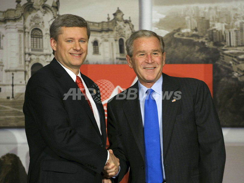 ハーパー首相が「ローリーン(Laureen Harper、首相夫人)と私は大統領ご夫妻のご多幸をお祈りしています。1月20日までにもう一度ローラ(Laura Bush、米大統領夫人)とあなたにお会いできることはないかもしれませんが」と語ったのに対し、ブッシュ氏が「つまり(わたしの)定年退職の前だね」とジョークで返した。(c)AFP