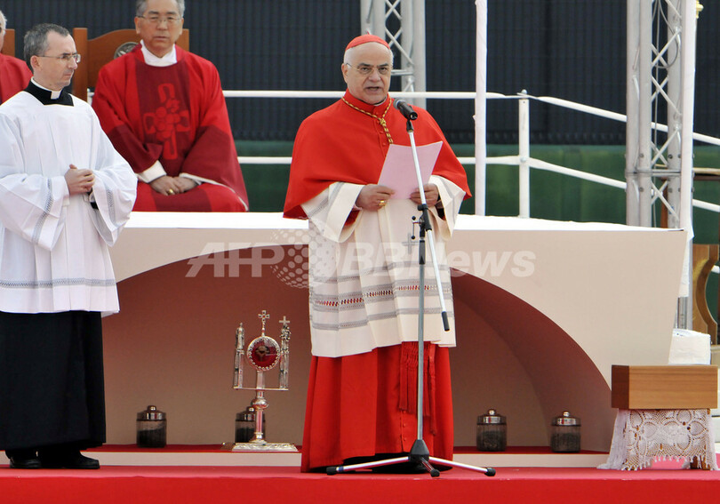 【11月25日 AFP】長崎市内の県営野球場で24日、江戸時代初期に幕府の迫害で殉教したキリシタン188人に、「聖人」に次ぐ「福者」の位を授ける「列福式」が開かれた。日本で初めて行われた列福式には、式典はローマ法王ベネディクト16世(Benedict XVI)の代理、法王庁の前列聖省長官ホセ・サライバ・マルチンス(Jose Saraiva Martins)枢機卿によって執り行われ、国内やアジアから3万人を超えるカトリック教徒が参列した。(c)AFP