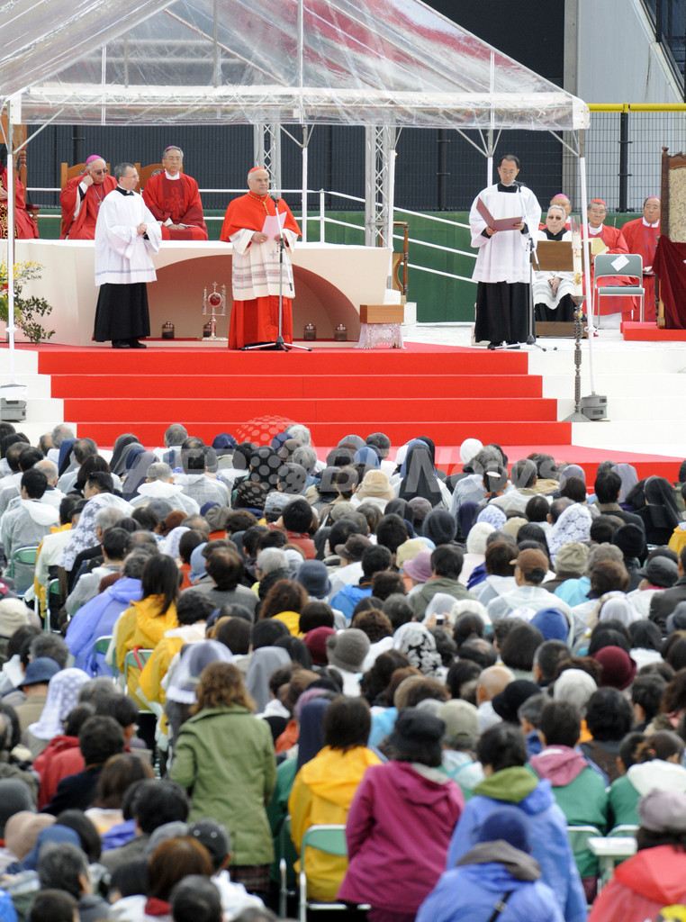 【11月25日 AFP】長崎市内の県営野球場で24日、江戸時代初期に幕府の迫害で殉教したキリシタン188人に、「聖人」に次ぐ「福者」の位を授ける「列福式」が開かれた。日本で初めて行われた列福式には、式典はローマ法王ベネディクト16世(Benedict XVI)の代理、法王庁の前列聖省長官ホセ・サライバ・マルチンス(Jose Saraiva Martins)枢機卿によって執り行われ、国内やアジアから3万人を超えるカトリック教徒が参列した。(c)AFP
