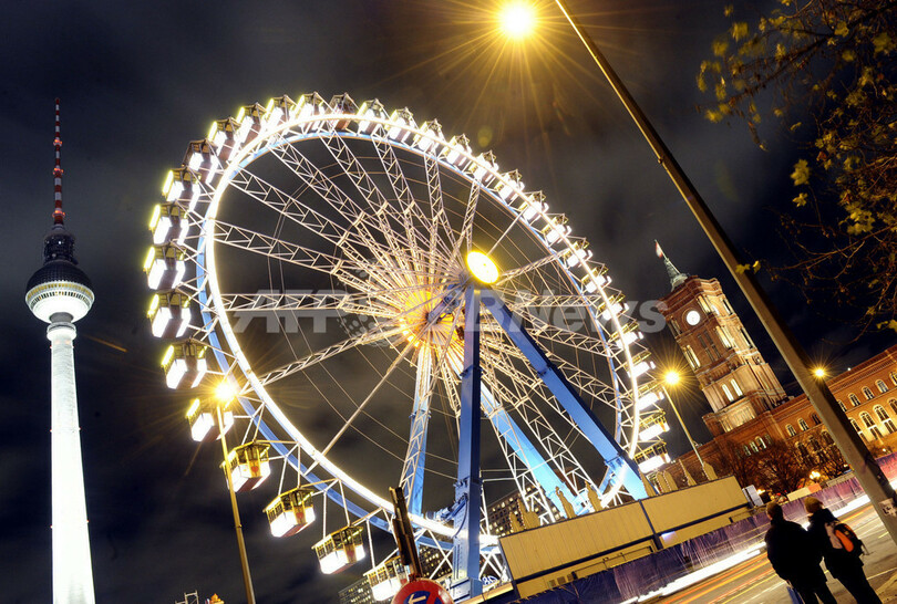 ドイツの首都ベルリン(Berlin)で、テレビ塔をバックにライトアップされた観覧車。ドイツ各地では24日にクリスマス市がオープンし、本格的なクリスマスシーズンが始まった。(2008年11月20日撮影)(c)AFP/DDP/CLEMENS BILAN