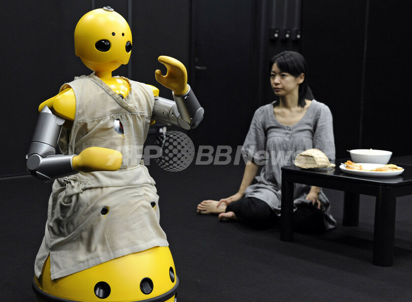 「出演」したのは三菱重工業(Mitsubishi Heavy Industry)が製作した人型コミュニケーションロボット「Wakamaru(ワカマル)」の「モモコ(Momoko)」と「タケオ(Takeo)」。来年での一般上演を目指し、報道陣の前で20分ほど演技が披露された。(c)AFP