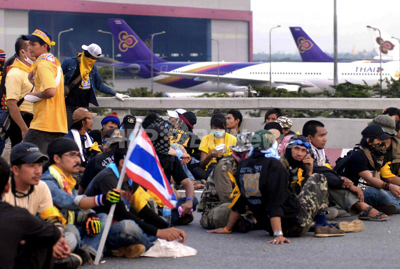 空港当局者によると、PAD支持者が建物内に突入したことで空港が閉鎖されたため、スワンナプーム空港では少なくとも3000人の利用客が立ち往生しているという。(c)AFP