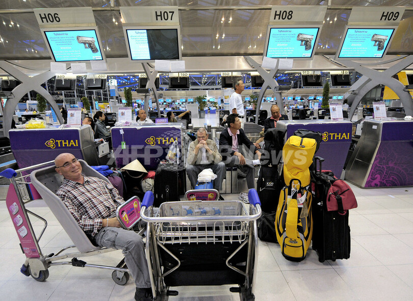 空港当局者によると、PAD支持者が建物内に突入したことで空港が閉鎖されたため、スワンナプーム空港では少なくとも3000人の利用客が立ち往生しているという。(c)AFP