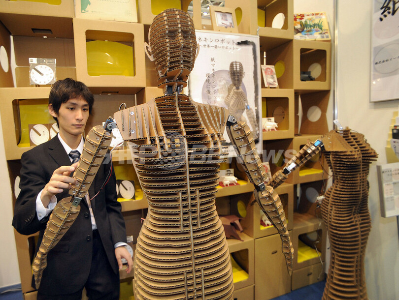 ニュース 環境・科学 こぼれ話 「世界一弱い」目指したダンボールロボ、国際次世代ロボットフェア 2008年11月27日 1:59 発信地:大阪 [ アジア・オセアニア 大阪 ] このニュースをシェア ‹ › ❮ 2/5 ❯ 大阪市で開催中の「国際次世代ロボットフェア」で、ロボット開発ベンチャーのイーガー(Eager)などが製作したダンボール素材の「紙マネキンロボット」(2008年11月26日撮影)。(c)AFP/Yoshikazu TSUNO 画像作成中 ! 【11月27日 AFP】大阪(Osaka)市で26日開幕した「国際次世代ロボットフェア」で、「世界一弱いロボット!」を合言葉に製作されたダンボール素材のボディーを持つ「紙マネキンロボット」が登場した。 ロボット開発ベンチャーのイーガー(Eager)と包装設計などを行う城東紙器が共同出展した。 28日まで3日間の日程で開催されるこのフェアには、ロボット関連企業や研究所約60社が参加、最新のロボット技術を紹介している。(c)AFP 環境・科学 一覧へ> メディア・報道関係・法人の方向け 写真・動画 購入のお問合せ>