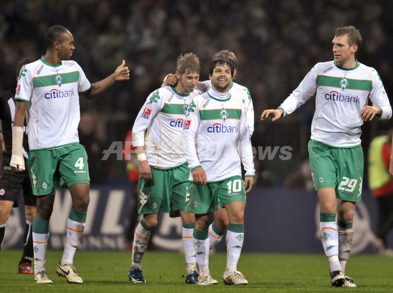 スポーツ サッカー ブレーメン フランクフルトに快勝 2008年11月30日 8:20 発信地:ベルリン/ドイツ [ ヨーロッパ ドイツ ] このニュースをシェア ‹ › ❮ 4/6 ❯ 後半30分にチームの5点目を決め、チームメイトからの祝福を受けるヴェルダー・ブレーメンのアーロン・フント(%%Aaron Hunt%%、左2)。(2008年11月29日撮影)(c)AFP/DDP/DAVID HECKER 画像作成中 ! 【11月30日 AFP】08-09ドイツ・ブンデスリーガ1部第15節、ヴェルダー・ブレーメン(Werder Bremen)対フランクフルト(Eintracht Frankfurt)。試合はクラウディオ・ピサロ(Claudio Pizarro)がハットトリック(前半11分、同20分、後半18分)を達成し、ブレーメンが5-0でフランクフルト快勝した。(c)AFP サッカー 一覧へ> メディア・報道関係・法人の方向け 写真・動画 購入のお問合せ>